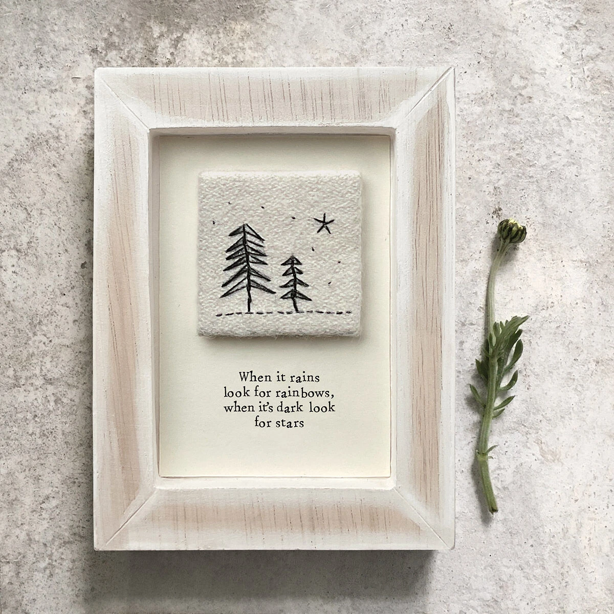Display this canvas picture embellished with a cream felt block in your home for a wonderful decorative addition. Embroidered with trees and stars, this gorgeous wooden frame from East of India is sure to look amazing in any home. Underneath the design are the words ‘When it rains look for rainbows, when it’s dark look for stars’ written in a vintage typewriter style font.
