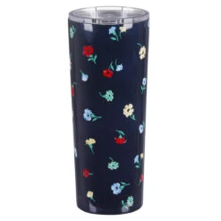 This durable travel mug is decorated with ditsy flowers in white, pinks, sage green and warm yellow all set against a black background, and the black lid allows the pattern to become the focal point.