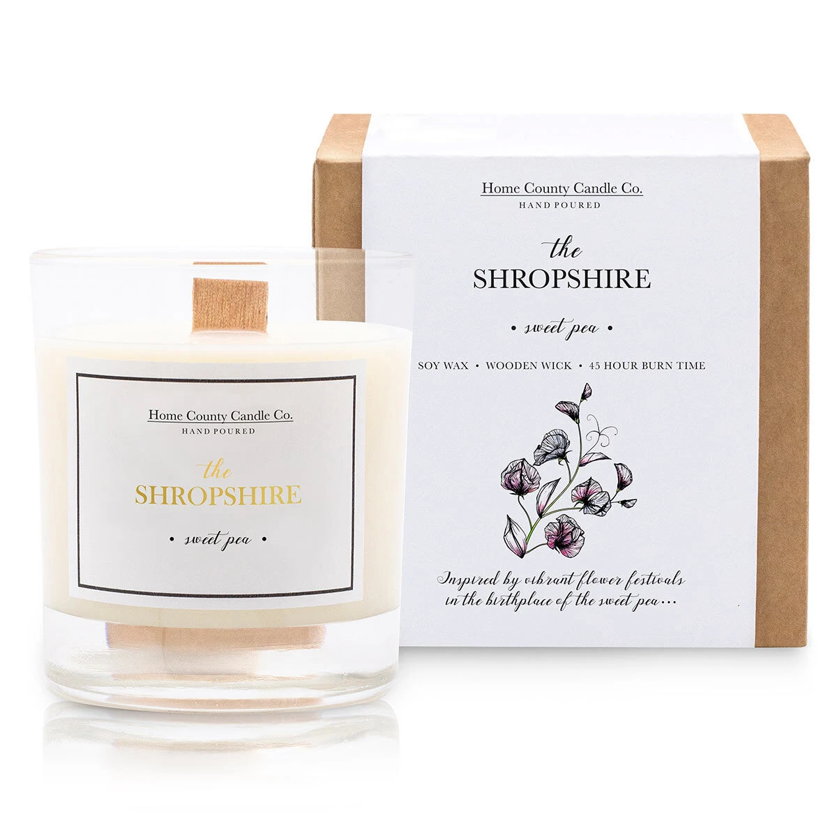 The elegant candle comes in a glass vessel with a modern stylish branded label, compete with the county title ‘The Shropshire’ written in golden text across the middle. The candle is packaged in a brown giftbox with a white sleeve featuring a stunning illustration which represents the fragrance ‘Sweet Pea’.