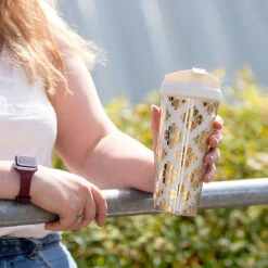 This luxurious tumbler is designed to look like a takeaway drinks cup, this tumbler features a bright pink acrylic straw and matching pink screw top lid. The main body of the tumbler is made from clear acrylic and is decorated with the dragonflies and tulips pattern. This pattern features a meadow of colourful tulips, set against a cream background, with delicate dragonflies’ flutter around the flowers. At the bottom of the tumbler is the Kate Spade logo printed in gold, this is the perfect elegant yet practical accessory to ensure you stay hydrated on the go!