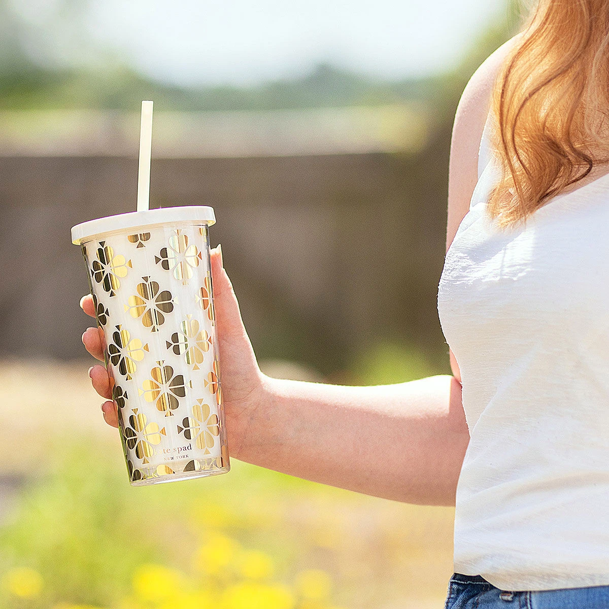 Kate Spade Gold Spade Flower Tumbler with Straw