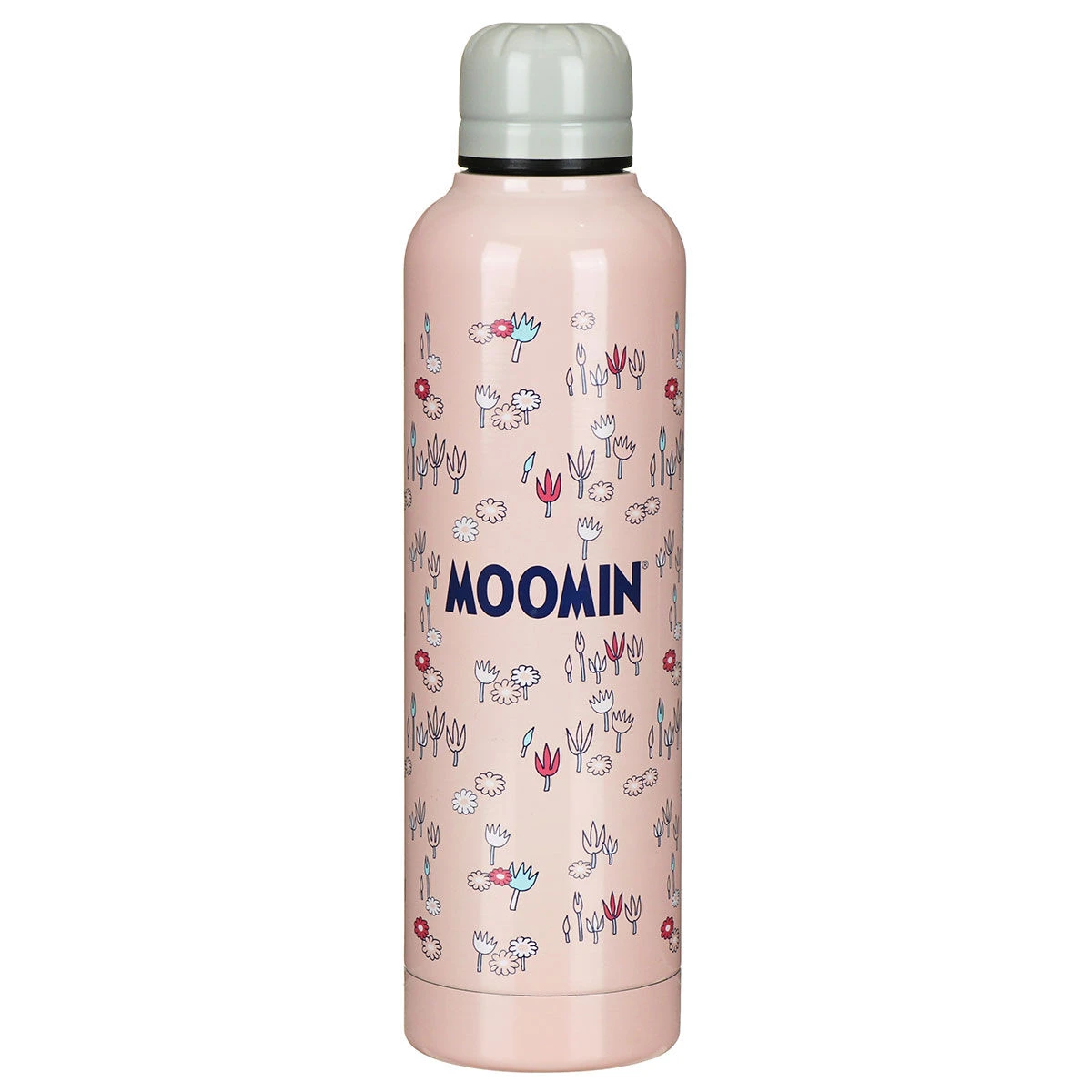This fun, pretty and eco-friendly water bottle features Moomintroll dancing amongst a meadow of flowers. The illustration is depicted in black and white set against a pale pink background with splashes colour highlighting the flowers and foliage. The floral meadow design wraps around the whole vessel, with the Moomin logo printed on the reverse.Â