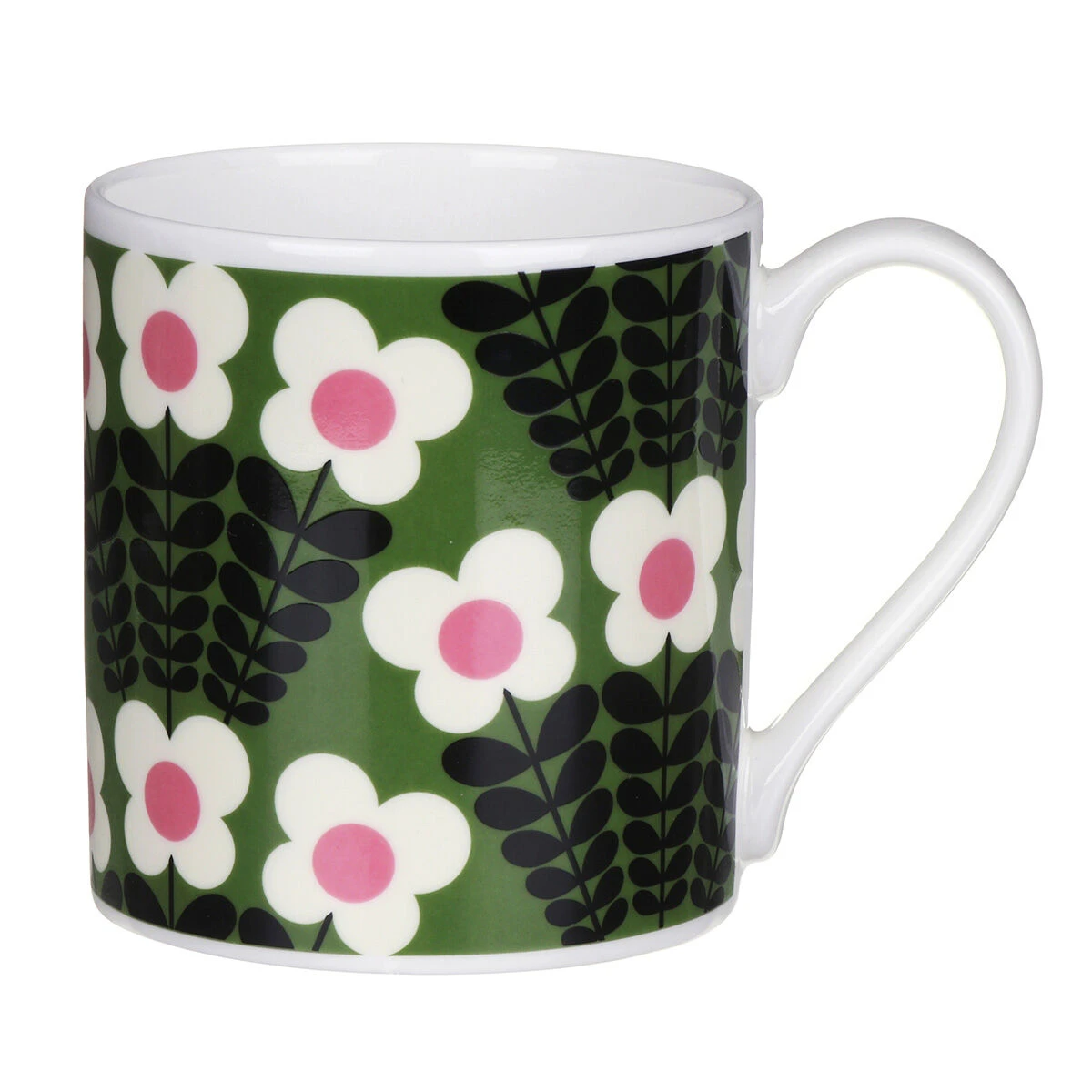 This stylish mug features the ‘Bunch of Stems’ design by Orla Kiely; three stems of leaves fan out creating an arrangement, each stem is topped with a white four petal flower with a pink centre. The bunch repeats around the edge of the mug set against a green background making the design stand out. Add a retro vibe to your kitchen with the simple design of this big mug that will fit into any scheme and particularly suits a modern kitchen!
