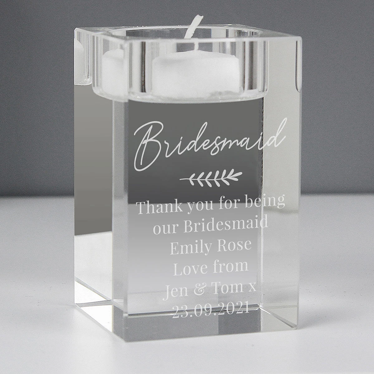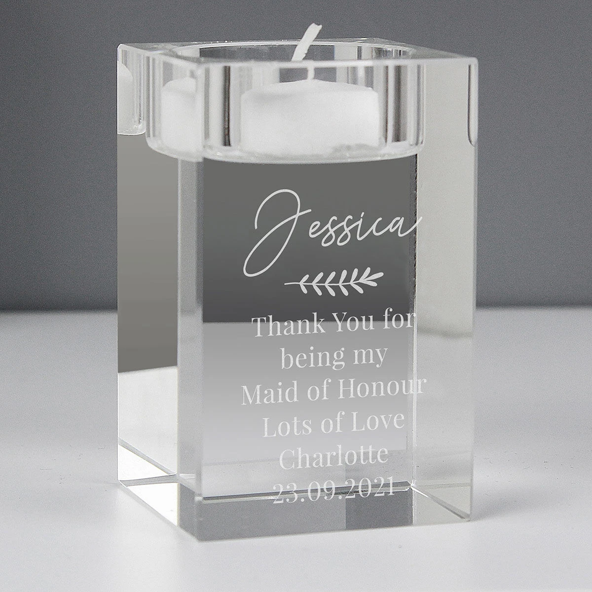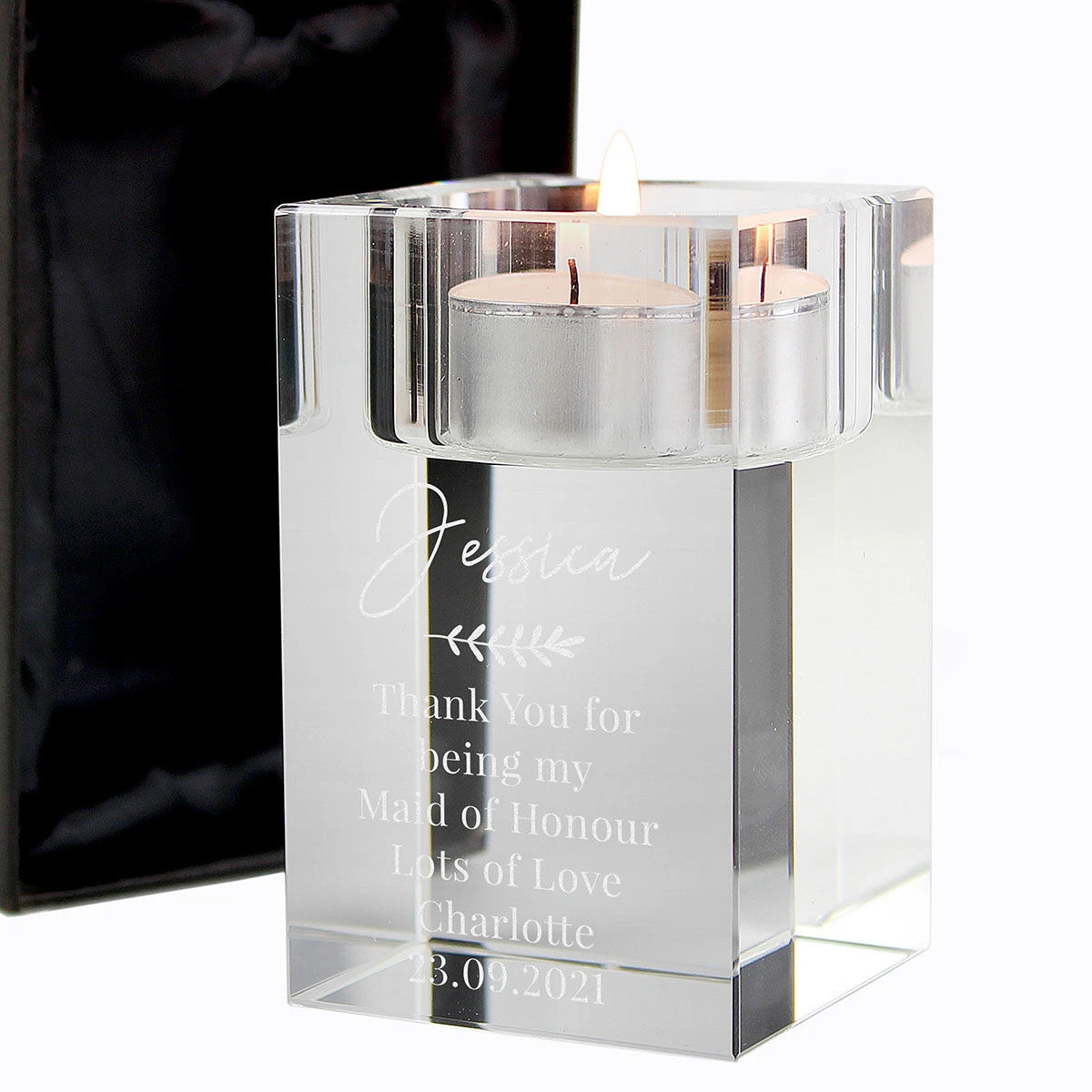 The perfect gift for that special someone. This tealight holder is a glass cuboid shape with a space in the top to place your very own tealight and small frosted leaf design on the front. Personalise this Tea Light Holder with a name or role and six lines which you can customise.