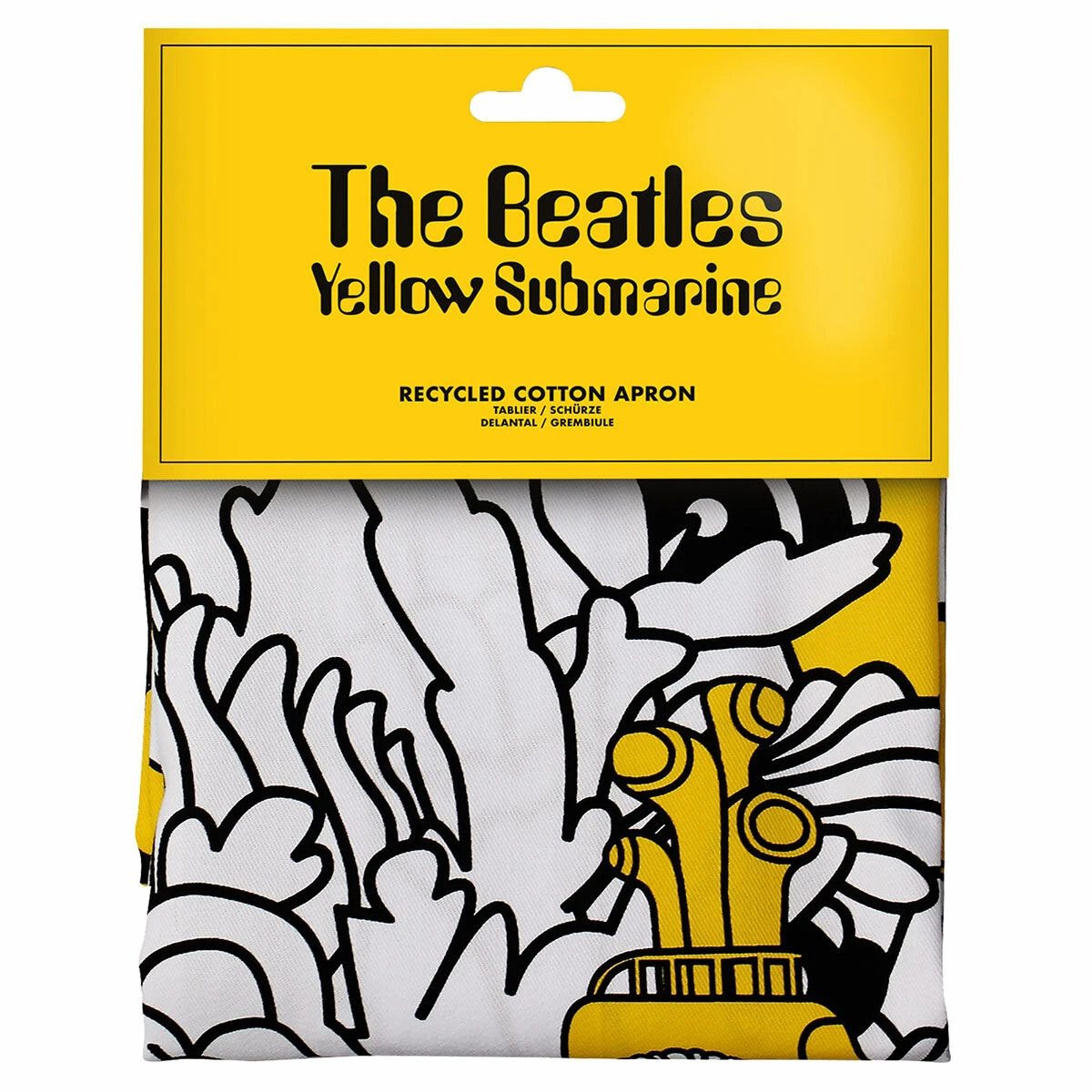 Made from recycled cotton, this gorgeous apron is decorated with a scene featuring the iconic yellow submarine from the film set amongst the ocean life with a psychedelic white and yellow background.