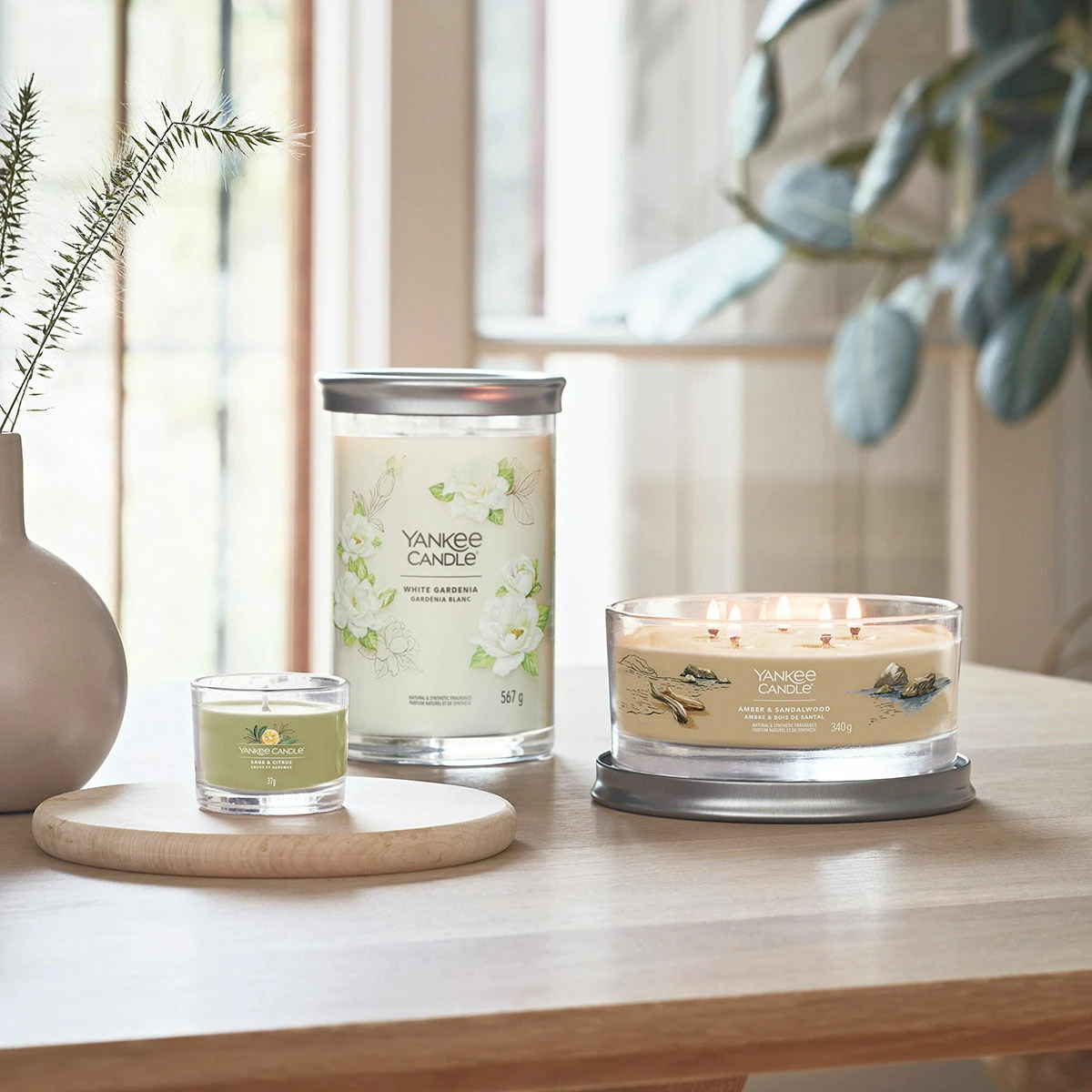 The wonderful fragrance of Amber & Sandalwood from Yankee Candle will leave you wanting to dig your feet into the sun warmed sand of a secluded beach. The sleek glass vessel of this Signature Multi-Wick Tumbler candle compliments the fragrance and will look wonderful on your coffee table or mantlepiece. The candle comes with a silver metal lid that doubles as a stand to sit your candle on to protect your surfaces.