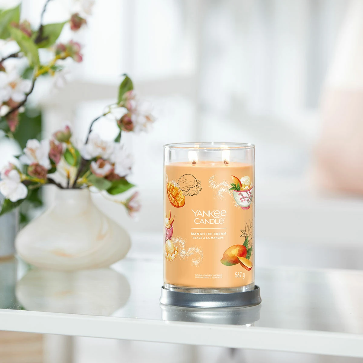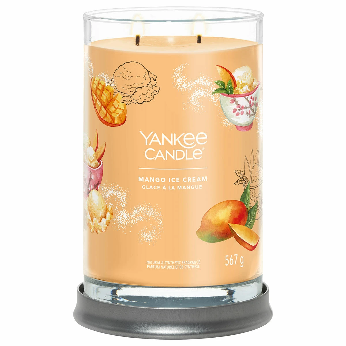 This luxurious Mango Ice Cream aroma from Yankee Candle features the aromas of this wonderfully fruity ice cream, scents of juicy mango and orange blend to remind you of the delicious dessert. This Signature Large Tumbler is a sleek glass vessel with straight sides that complement the fragrance and will look wonderful in any home décor theme, perfect for any home. The candle comes with a silver metal lid that doubles as a stand to sit your candle on to protect your surfaces. This wonderful aroma swirls around the fruity notes.