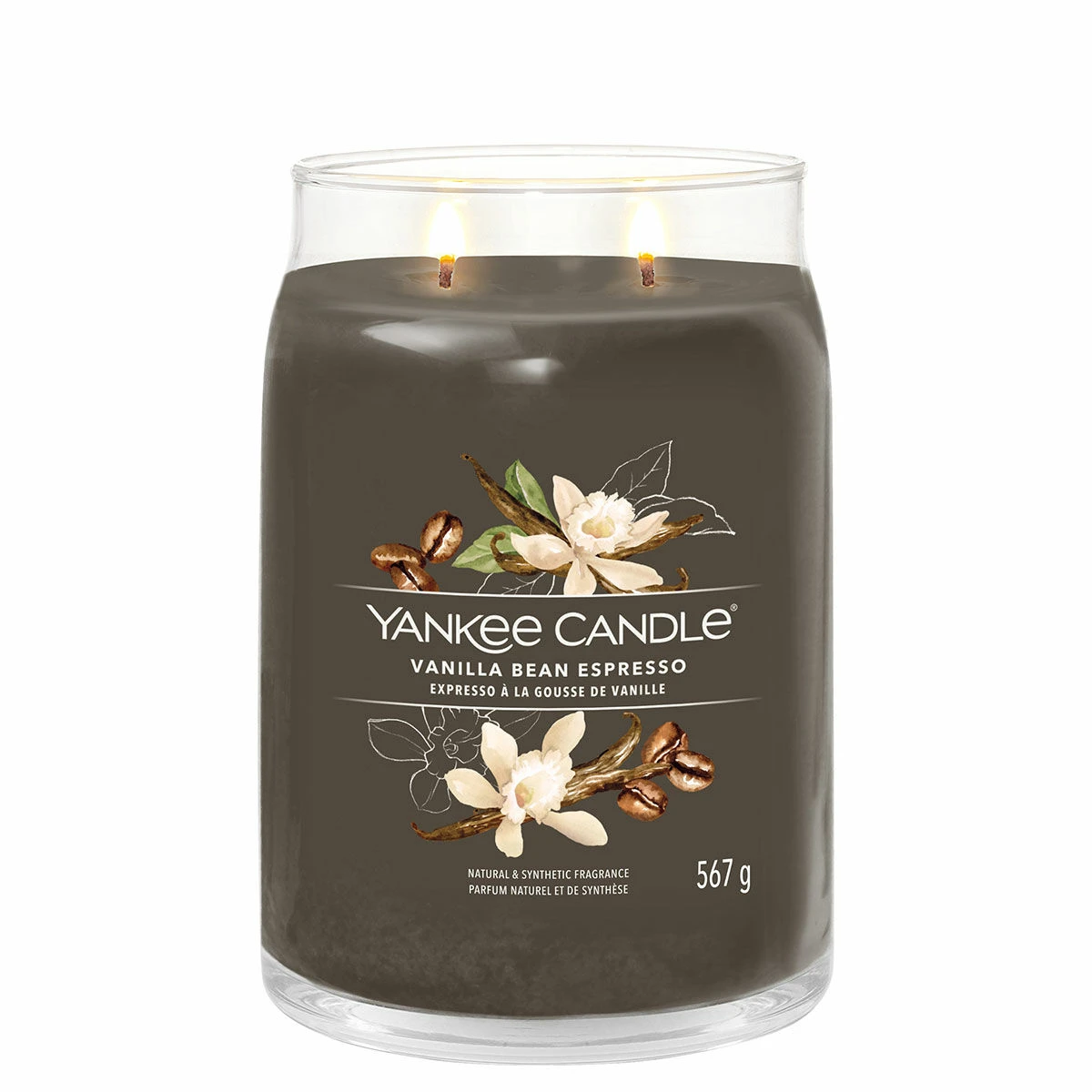 Enjoy the gorgeous Vanilla Bean Espresso fragrance in the wonderful Signature Large Jar Candle, a sleek glass vessel that compliments the fragrance and will look wonderful in your home. The wonderful fragrance from Yankee Candle is a rich blend of freshly ground coffee beans and sweet vanilla.