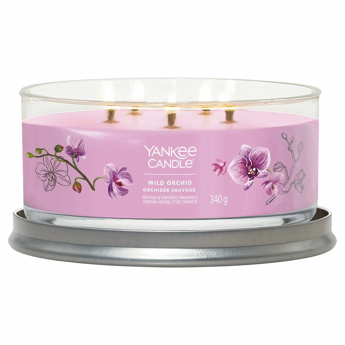 Full of intoxicating floral and sweet aromas, fill your home with the aroma of sweet, ripe fruit notes with this gorgeous Wild Orchid aroma from Yankee Candle. The sleek glass vessel of this Signature Multi-Wick Tumbler candle compliments the fragrance and will look wonderful on your coffee table or mantlepiece. The candle comes with a silver metal lid that doubles as a stand to sit your candle on to protect your surfaces.